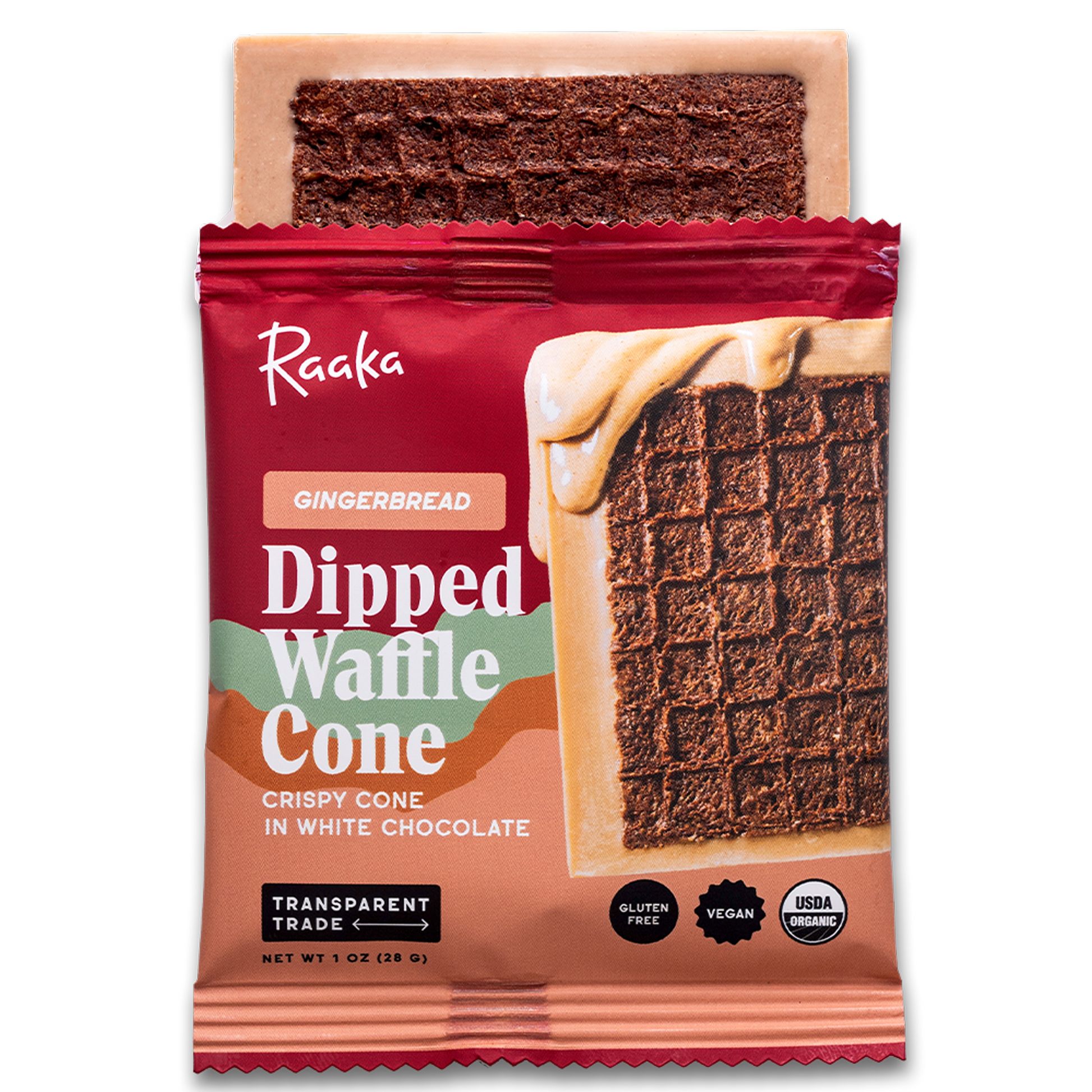 Our crispy chocolate waffle cone cookie dipped in a gingerbread-spice infused vegan white chocolate. Tastes like sitting next to a snow frosted window pane and listening to Nat King Cole. The perfect Christmas stocking stuffer & holiday candy treat. 1 OZ Square.
