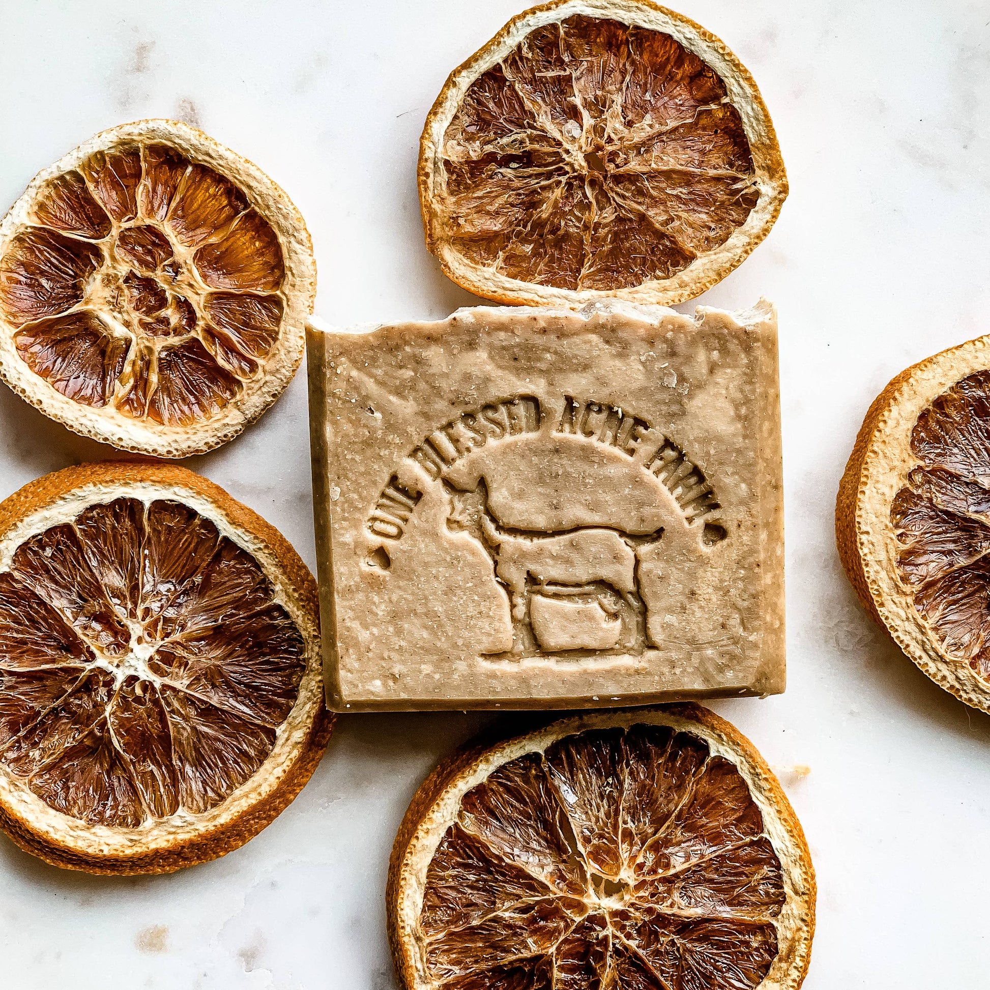 Our cold-process Goat Milk Soap is handcrafted in small batches using only the finest and most gentle ingredients. This frothy-sudsing, nutrient-dense, natural cleansing bar is a treat your entire body will love! • Scent: Orange Clove is warm zesty orange with cloves & cinnamon. • 4.5 ounce bar soap • Enclosed in muslin bag with paper hang tag (all compostable) The nutrients found in goat milk help to heal dry, cracked skin and soothe inflammation • Available in a wide variety of scents (including unscented!)